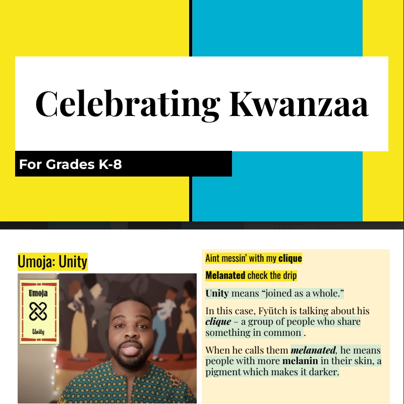 Download this Kwanzaa Lesson Plan for Elementary and Middle School. Perfect for learning about Kwanzaa principles and the 7 days. Includes a slideshow, a fun rap activity, and “This Kwanzaa” song, lyrics, and instrumental.